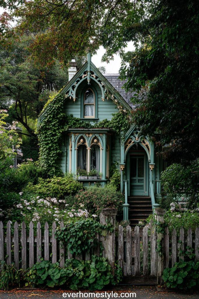 Warm timber accents ground this small Victorian cottage in nature, while blue siding keeps the palette cool and composed. Intricate vergeboards and bracket details emphasize the craftsmanship that defines the era. It’s an inviting mix of rustic warmth and tailored Victorian character.