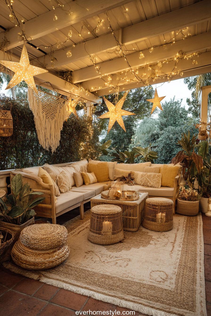 Golden stars and woven textures transform this patio into a dreamy boho retreat. The glowing ambiance inspires holiday creativity.