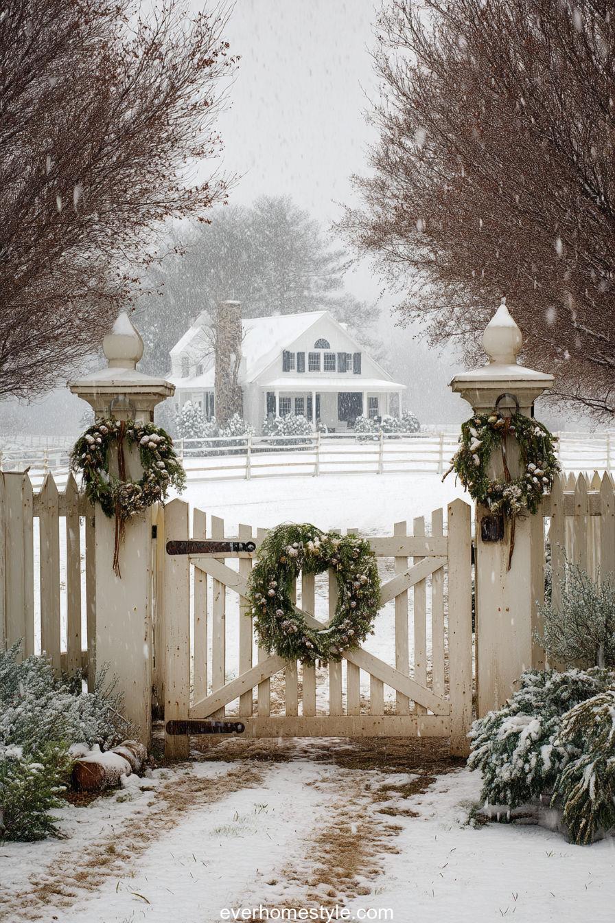 A snowy gate framed with evergreen wreaths and a gentle glow — pure countryside tranquility.