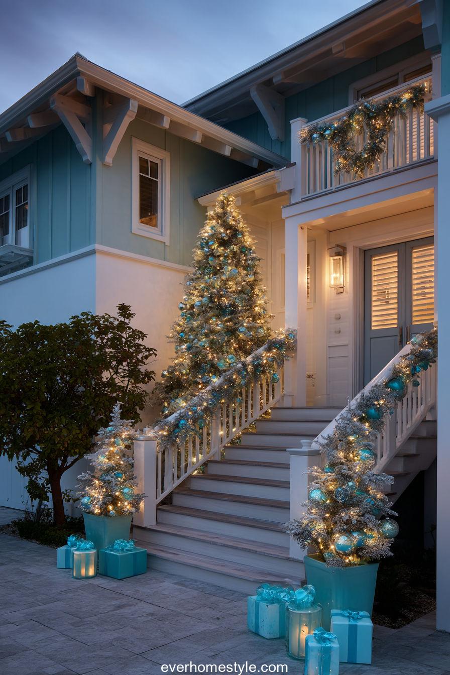 A modern coastal home glowing at dusk, with turquoise accents reflecting ocean-inspired holiday decor.