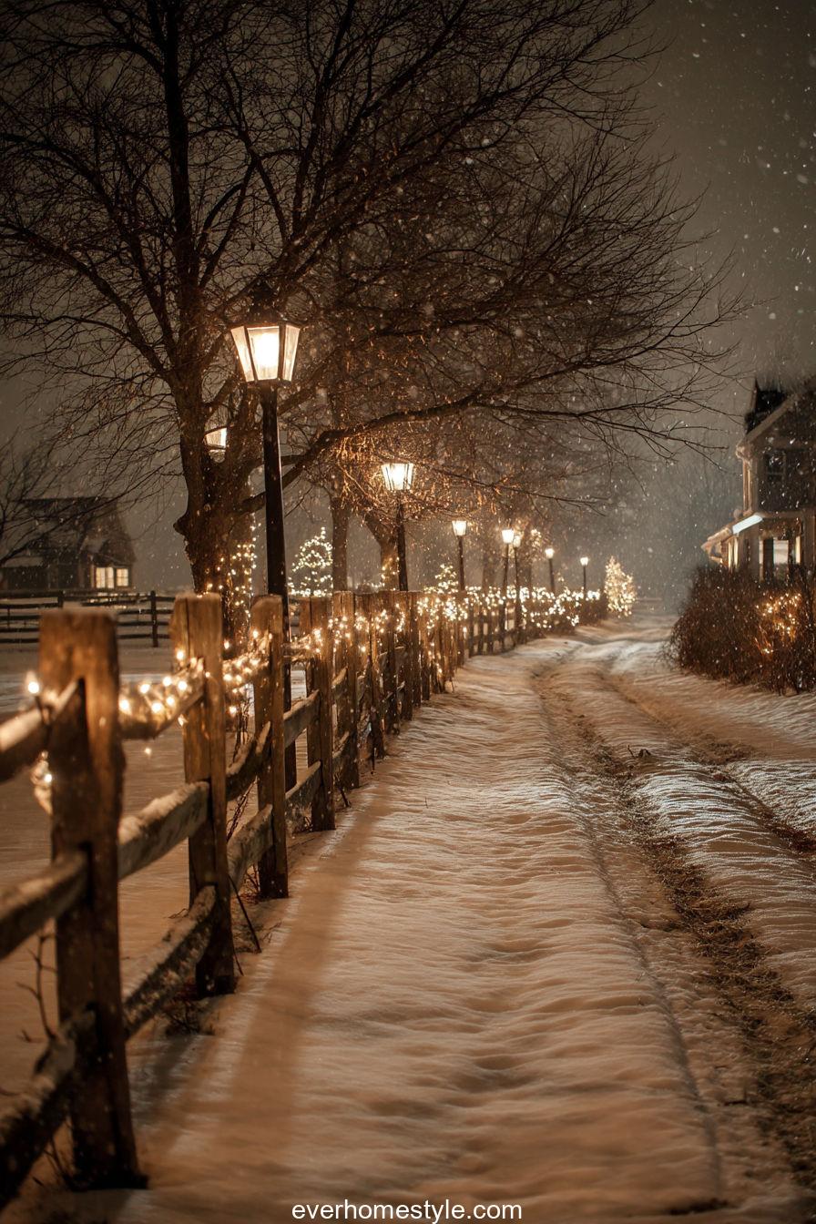 A rural lane lined with glowing lampposts and fences wrapped in lights feels straight from a holiday movie.