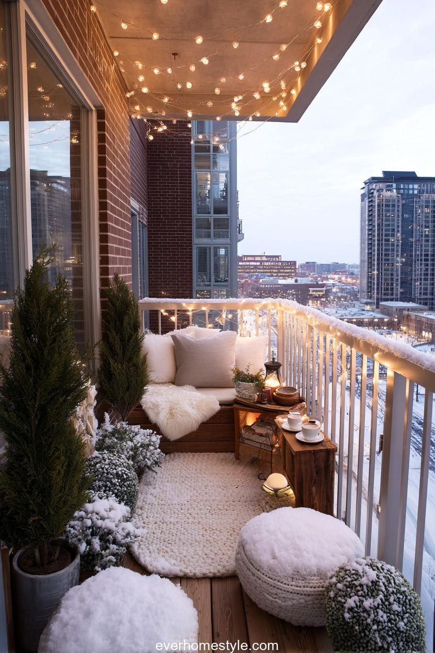 Small-space magic: an urban balcony filled with fairy lights, plaid throws, and steaming cocoa for Christmas nights in the city.