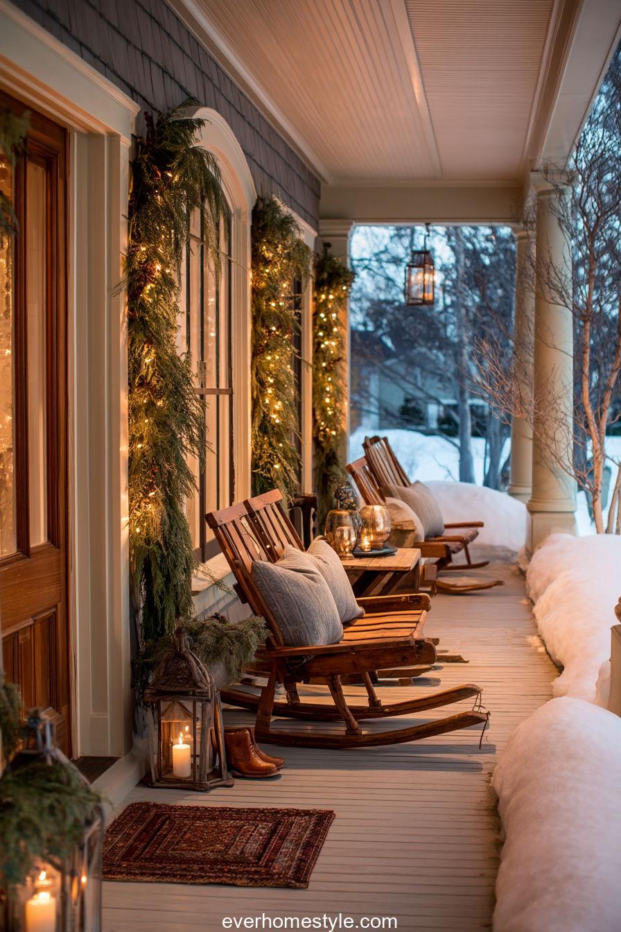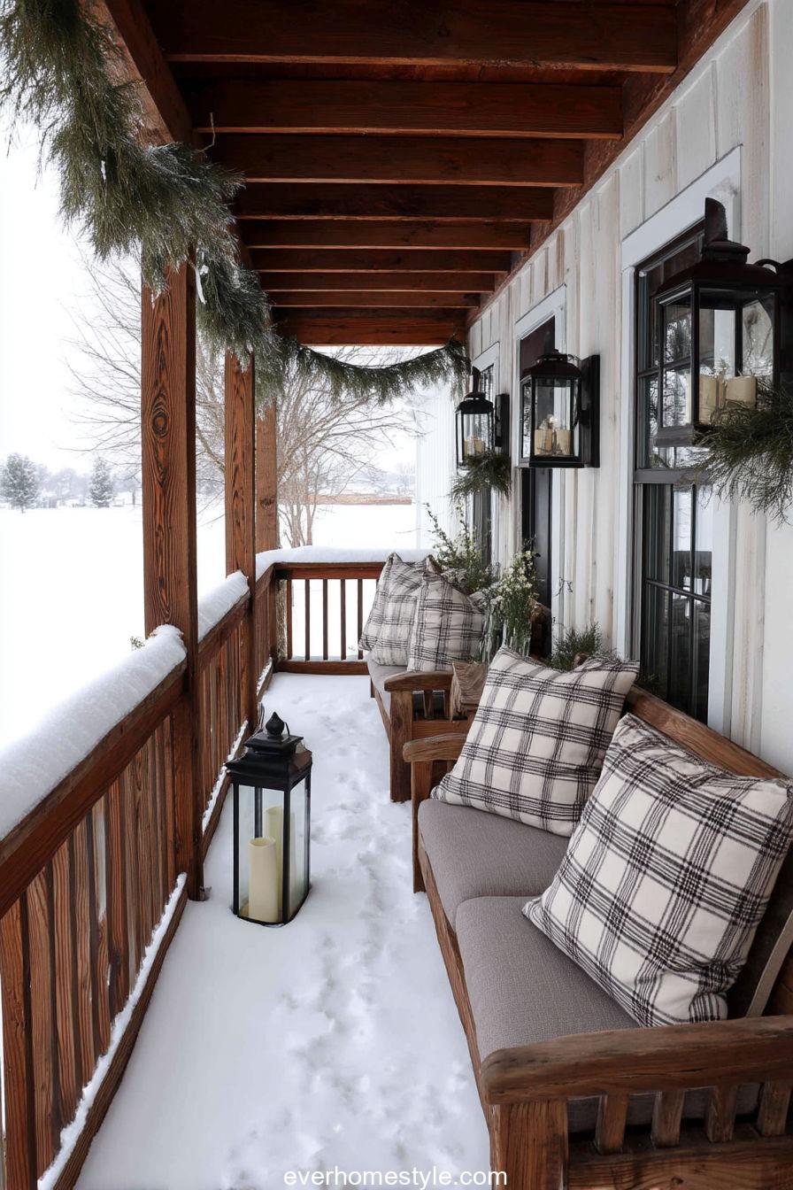A rustic farmhouse porch blanketed in snow, with plaid cushions and evergreen garlands adding rustic comfort.