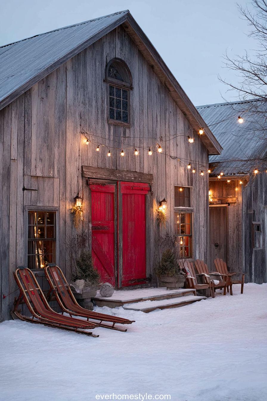 Rustic red barn doors sparkle with string lights and wreaths. A nostalgic nod to classic countryside holidays.