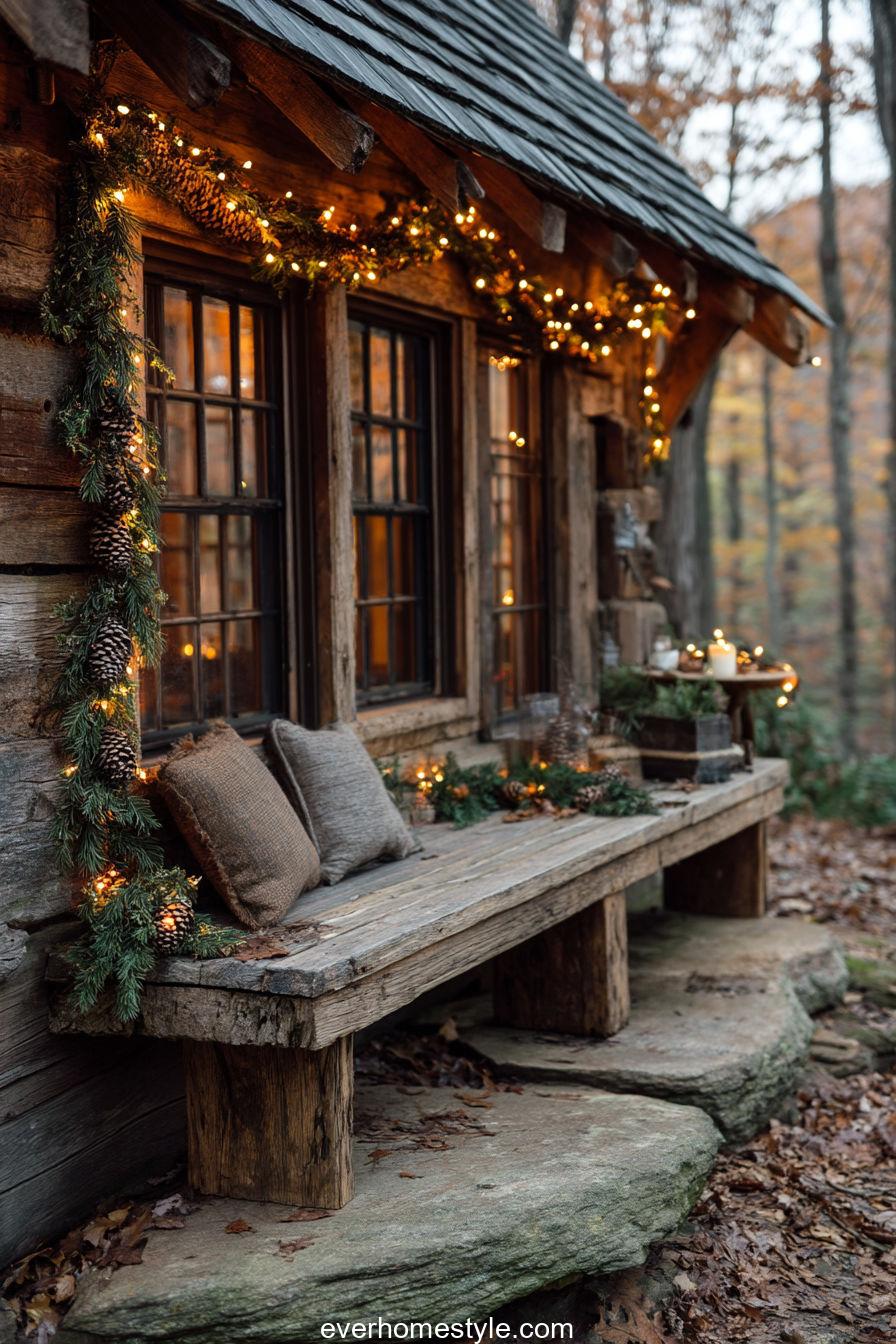 A woodland hideaway where pinecones, benches, and garlands blend seamlessly into nature’s Christmas scene.