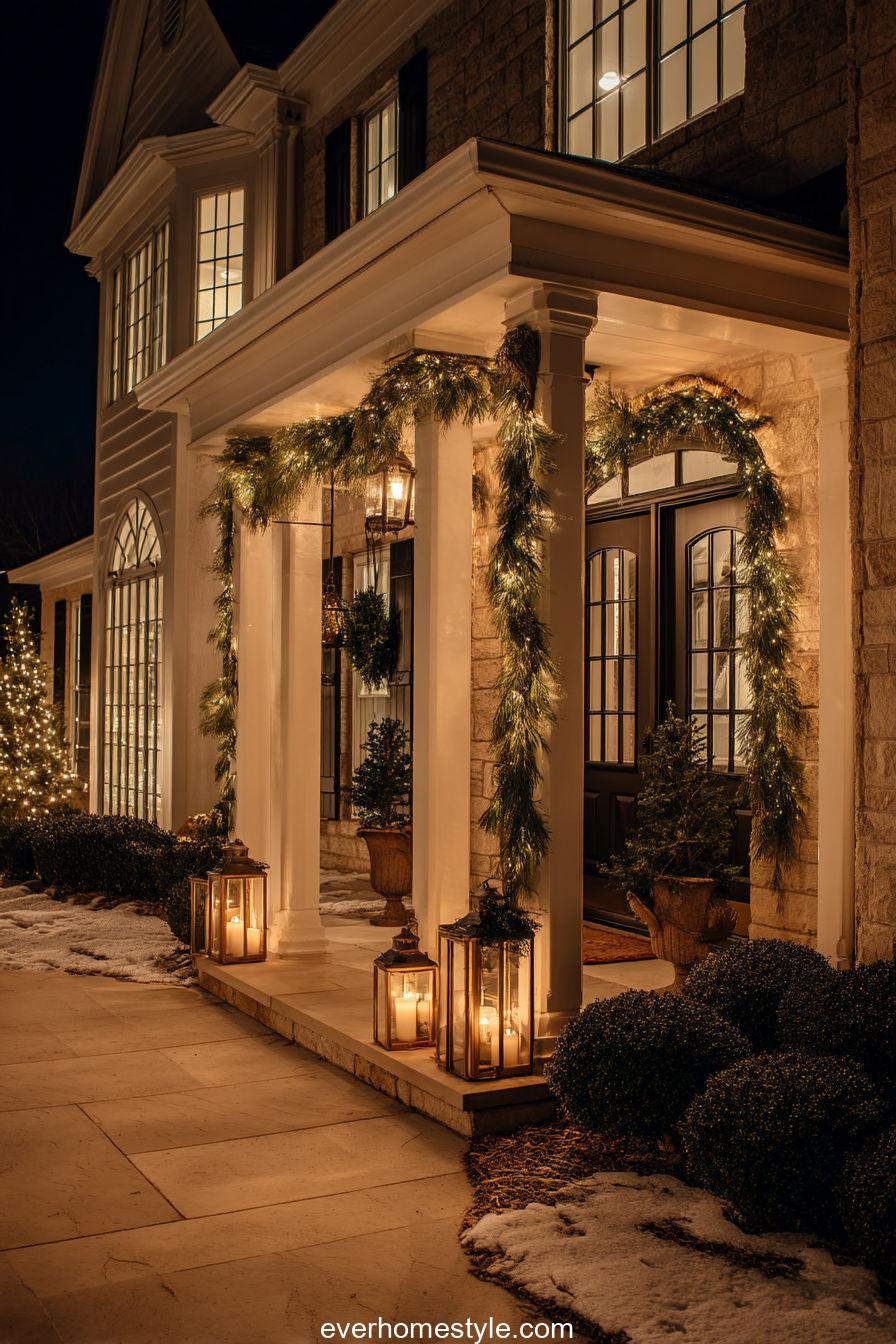 A porch framed in warm white lights and lanterns evokes a magical entrance. The golden glow enhances a feeling of welcome and timeless Christmas joy.