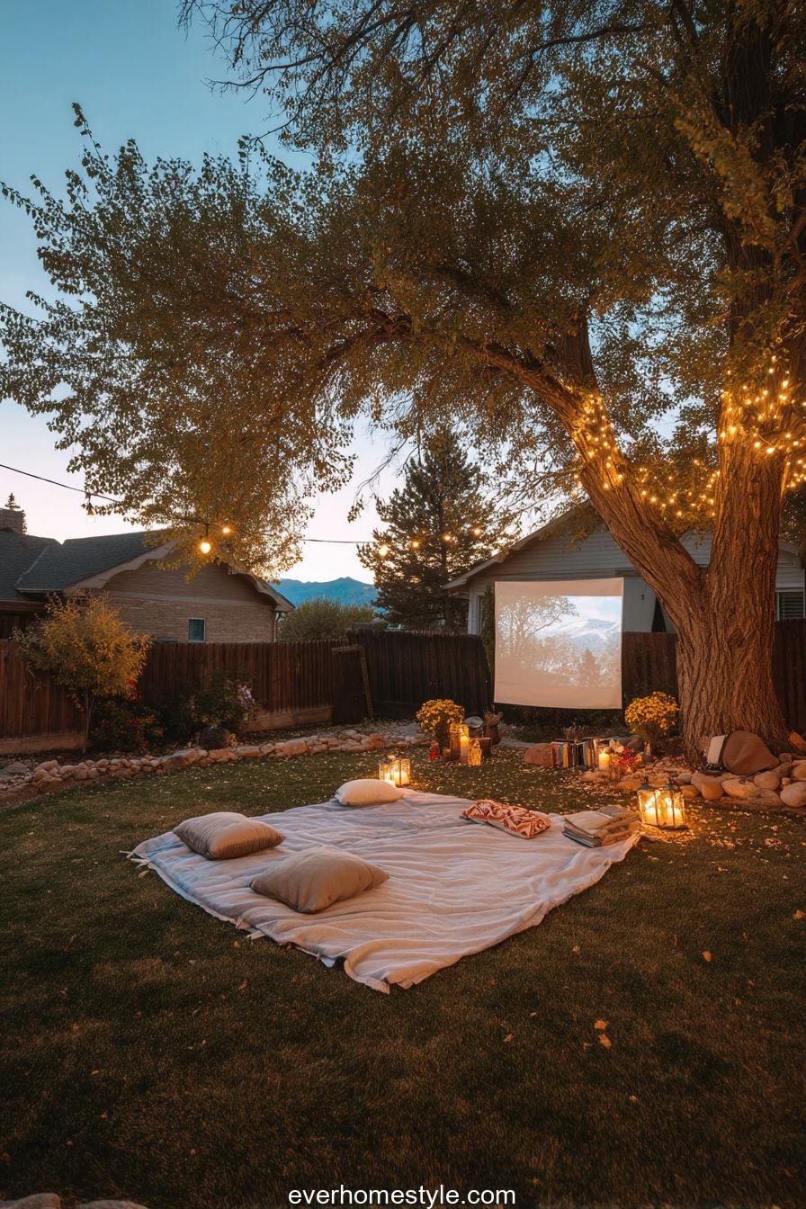 Blankets, cocoa, and laughter fill this open-air cinema setup. The perfect outdoor experience for family and friends.