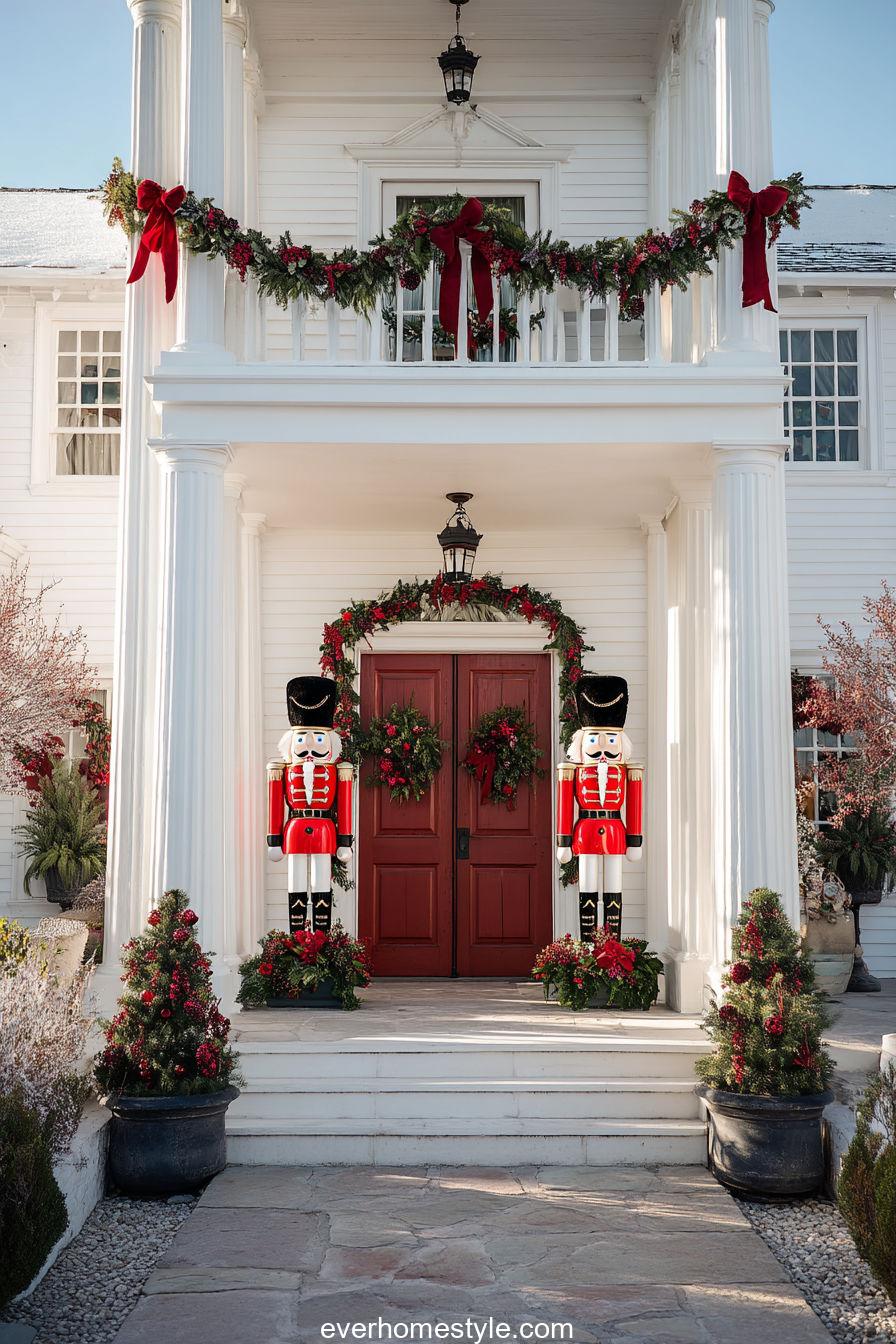 Grand nutcracker figures stand beside a rustic farmhouse door, surrounded by garlands and bows. A bold, regal take on outdoor holiday charm.