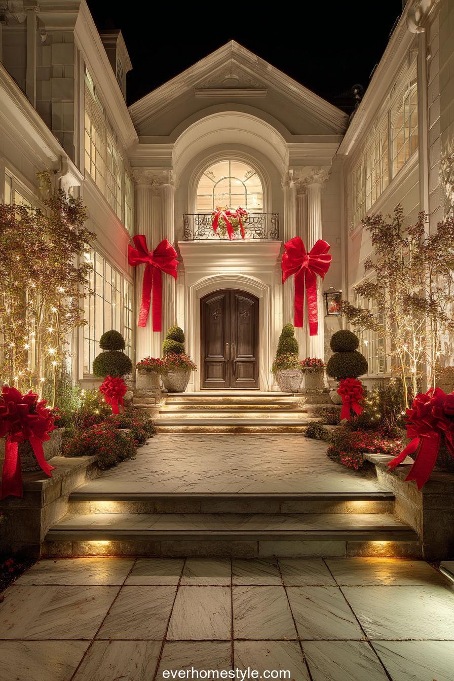 An opulent display of symmetry with velvet red bows and golden lighting, turning your mansion entrance into pure holiday elegance.
