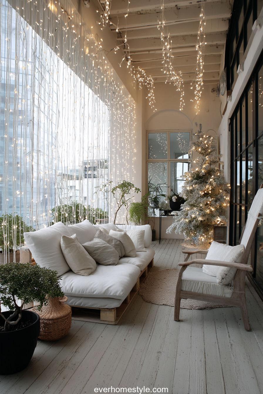 Curtains of light and a minimalist tree bring modern simplicity to urban Christmas decor.