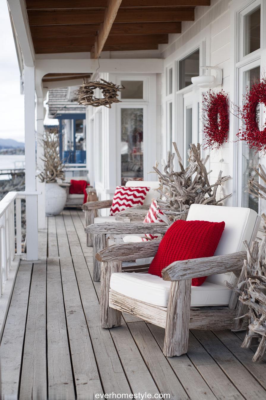 Driftwood wreaths and nautical red-white tones bring the seaside into your Christmas celebration with relaxed elegance.