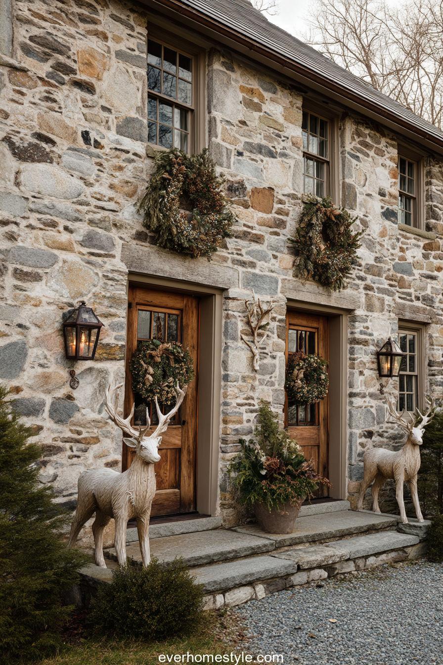 A quaint stone cottage trimmed with frosted wreaths and wooden deer captures the essence of cozy countryside holidays.