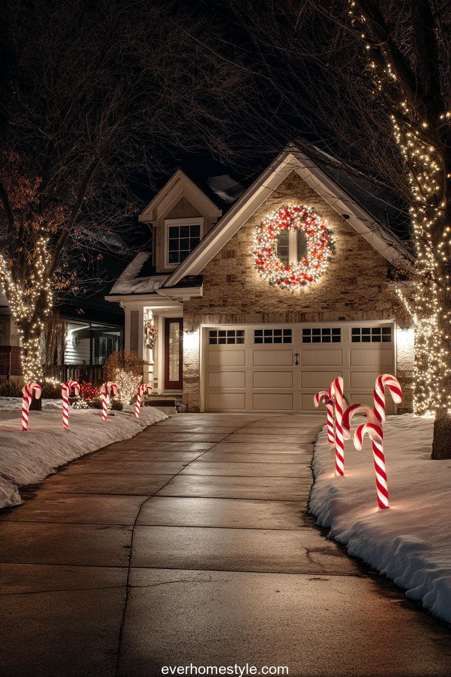 A playful entryway featuring glowing candy canes and a grand wreath for a sweet and merry arrival.