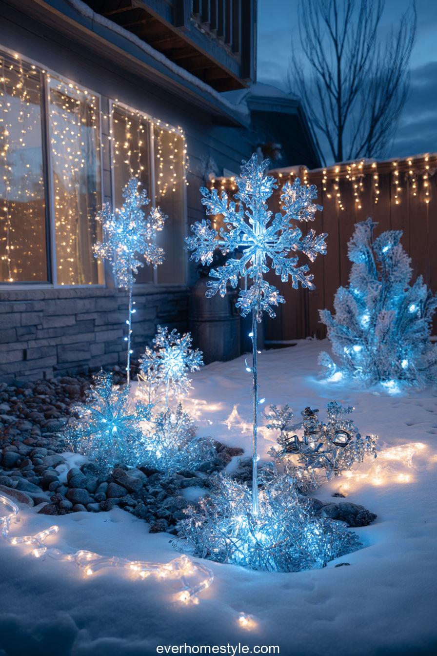 Transform your yard into a luminous winter paradise with icy blue lights and silver accents that shimmer like snow crystals.
